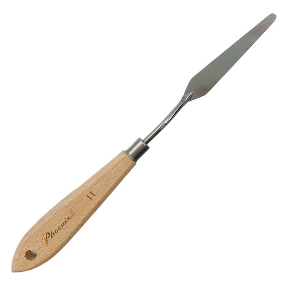 Es hat einen 10 cm langen profilierten Holzgriff und eine 92 x 18 mm große elastische Metallspitze.