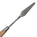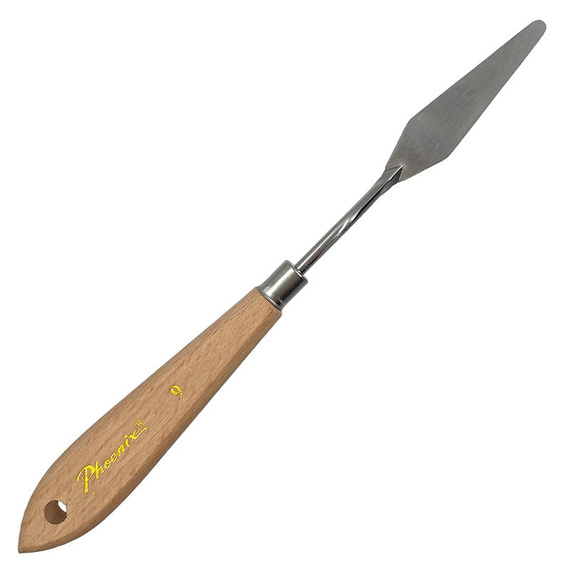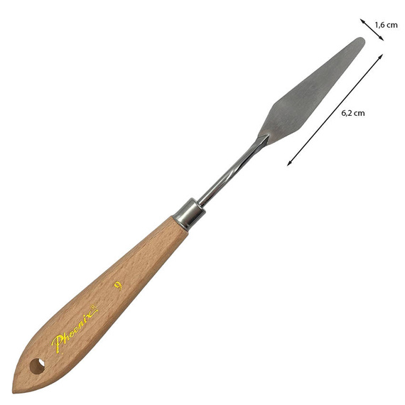 Es hat einen 10 cm langen profilierten Holzgriff und eine 83 x 23 mm große elastische Metallspitze.
