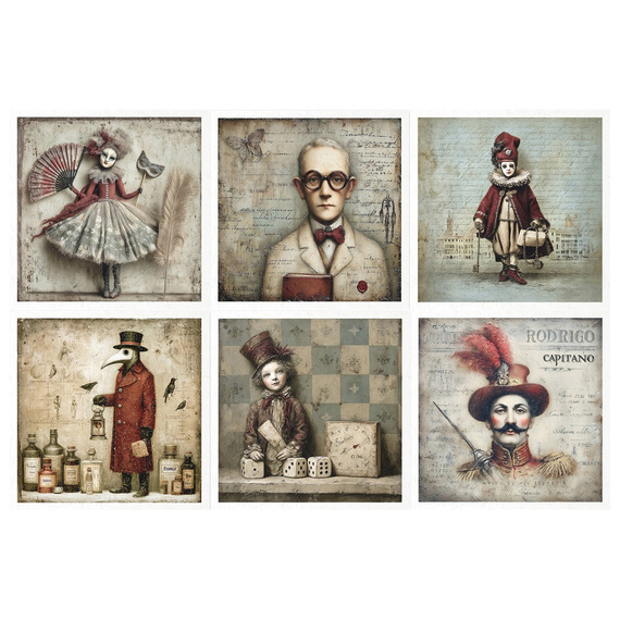 Das Set umfasst sechs bezaubernde Illustrationen, die eine magische, theatralische Geschichte erzählen – auf jedem Papier sind Figuren aus der bunten Welt des Karnevals abgebildet.
