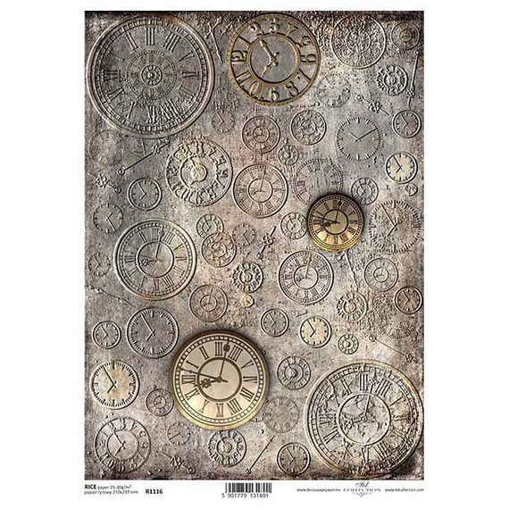 ITD Reispapier Decoupage Bastelpapier Serviettentechnik-R1116 - A4 Uhren Uhr, Zifferblatt, Zifferblatt, Zeiger, Stunden, Retro, Vintage, Steampunk